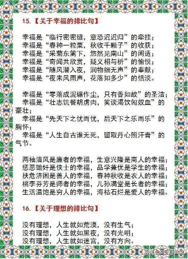 排比是一种把结构相同或相似、意思密切相关、语气一致的词语或句子成串地排列的一种修辞方法,利用意义相关或相近,结构相同或相似和语气相同的词组(主、谓、动、宾)或句子并排(三句或三句以上),段落并排(两段即可),达到一种加强语势的效果。排比的修辞功能可以概括为“增文势”“广文义”。排比项诽迭而出,语气一贯,节律强劲,各排比项意义范畴相同,带有列举和强化性质,可拓展和深化文意。